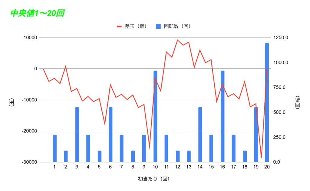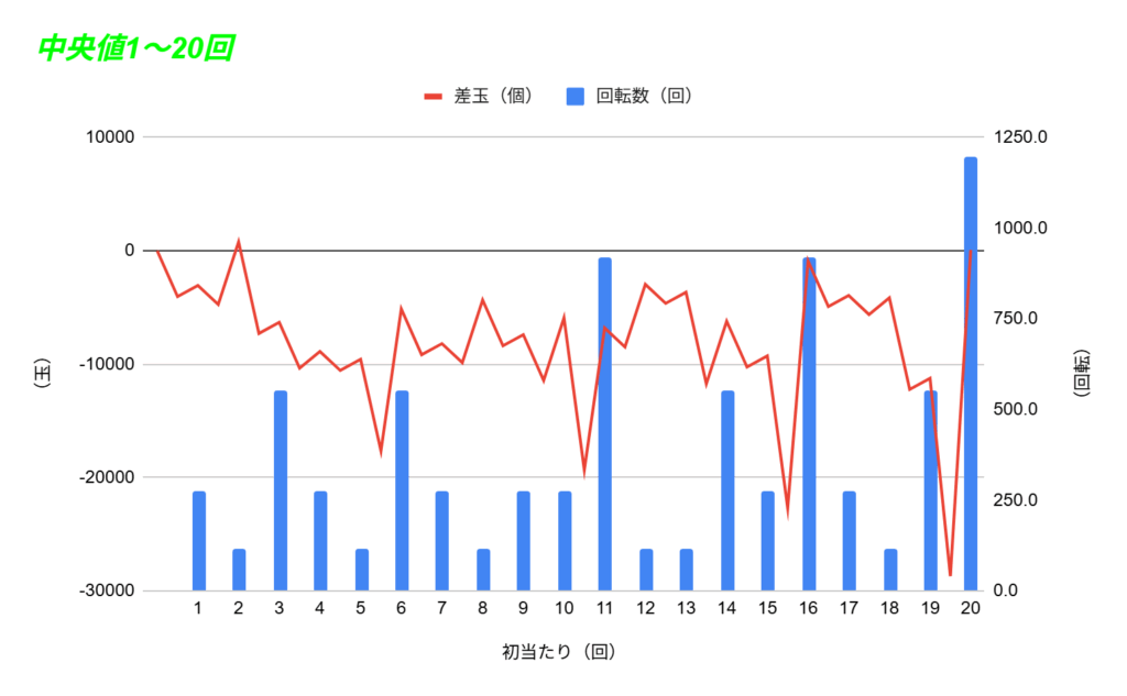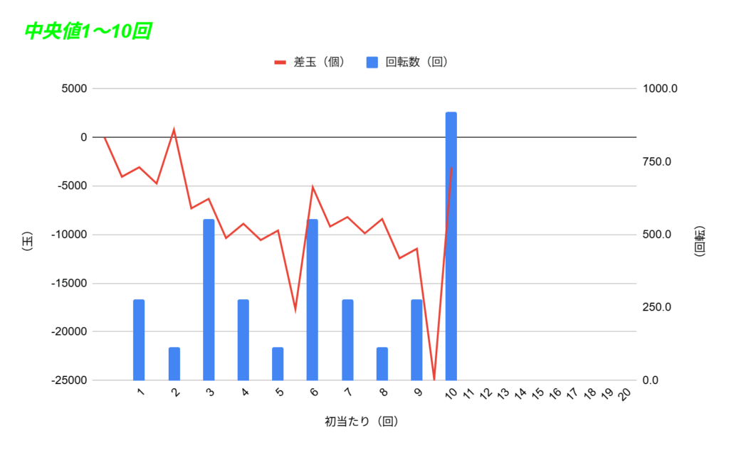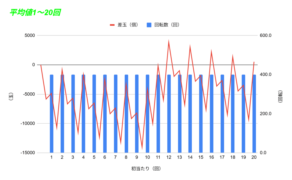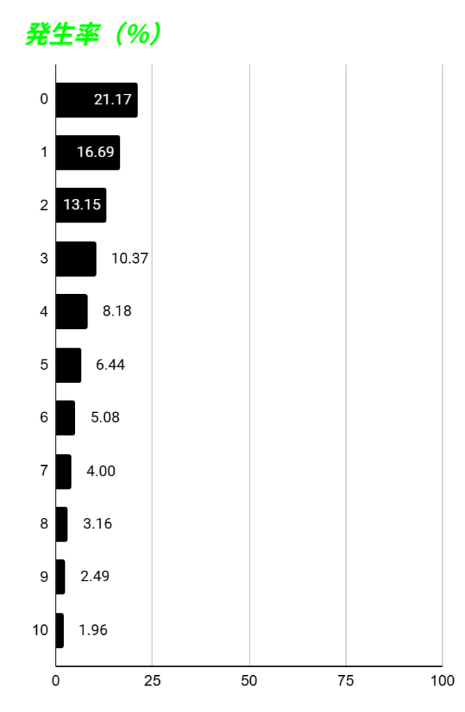 このグラフは1から10回がリアル寄りの「発生率が高いケース」、11から20回が平均値寄りの「発生率が低いレアケース」です。