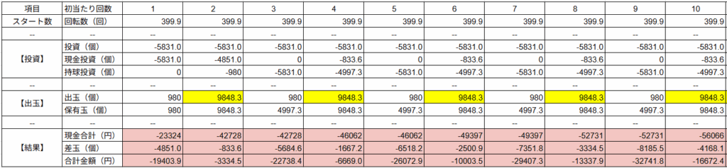 | トータル初当たり期待値(個) | 6247.5 | 5831.0 | 3465.5 |
