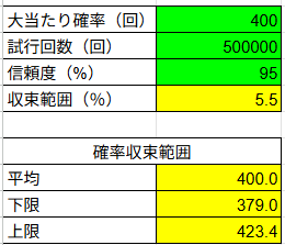 - 大当たり確率は約399分の1で、回数は平均約399回、中央値約277回