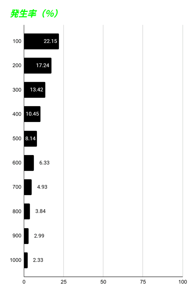 発生率累計ではなく、発生率として見るとこのグラフになり、100から順に発生率を足していき、500まで足すと大体75%。