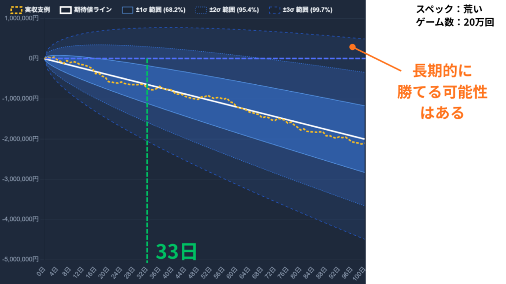 ほぼ100%負けるラインである33日の時点では
