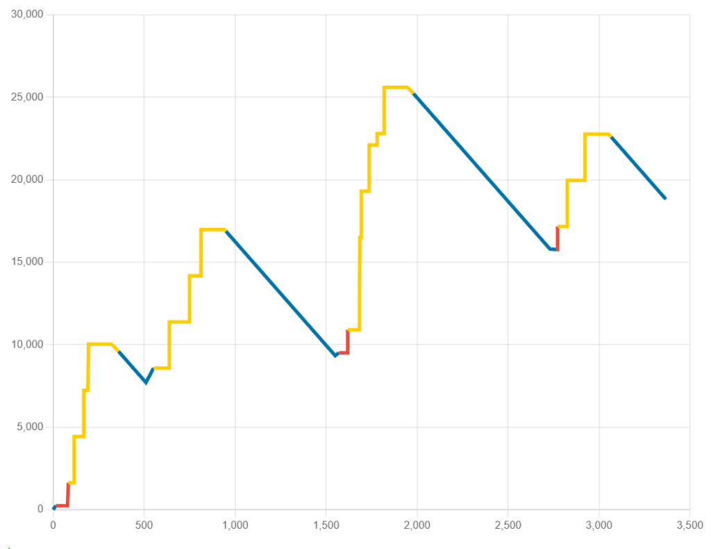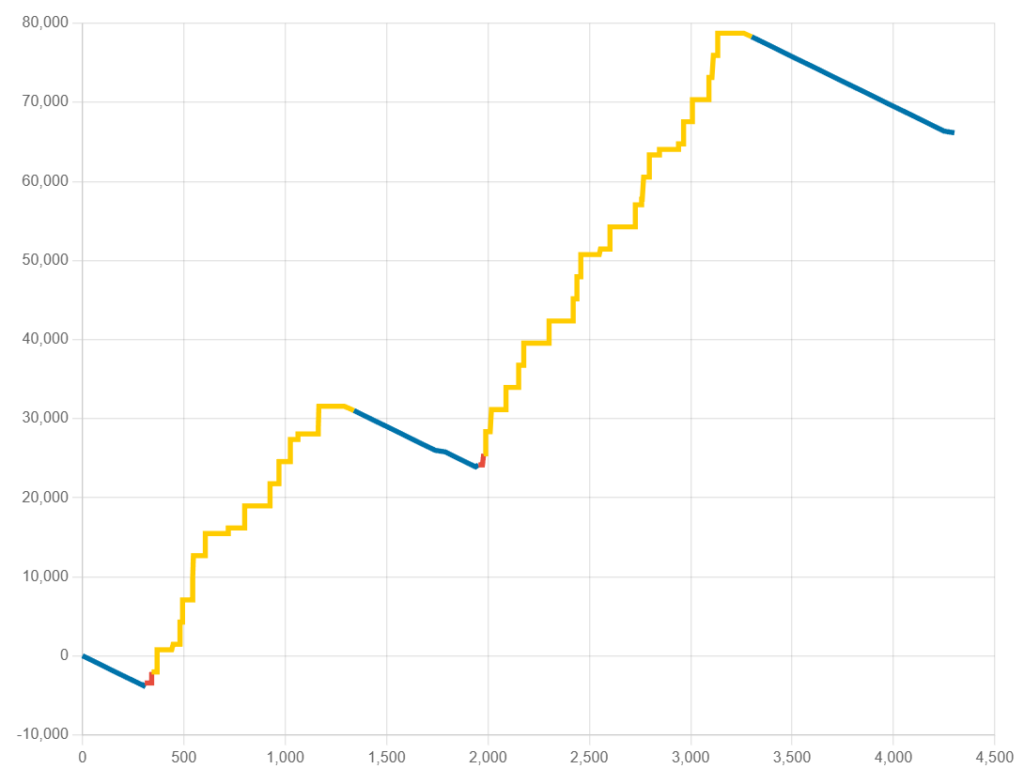 このグラフはシミュレーションの結果を、適当に抜き取ったサンプルグラフになります。全体のイメージとしては、割とちょいちょい当たっている。けど次の関門がある。