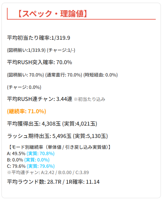 1つ目は実質まともな出玉が出る確率で、初当たり1/319×ラッシュ突入約70%×第一関門突破率約50%で、約1/900ということ。言い換えると上位ラッシュ突入率は初当たりの約35%になります。