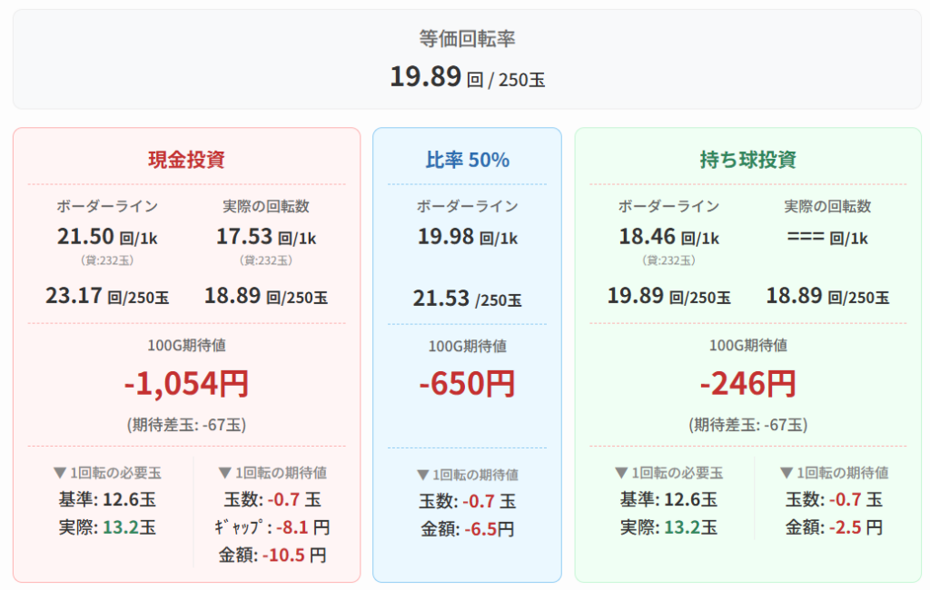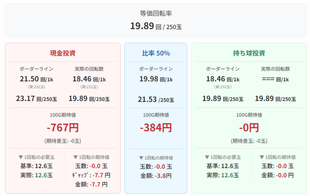 今回は参考として、貸出232玉、交換レート3.7円の数値を条件にして計算しています。現金の時と、持ち球の時、そしてその中間比率の数値を載せてあります。