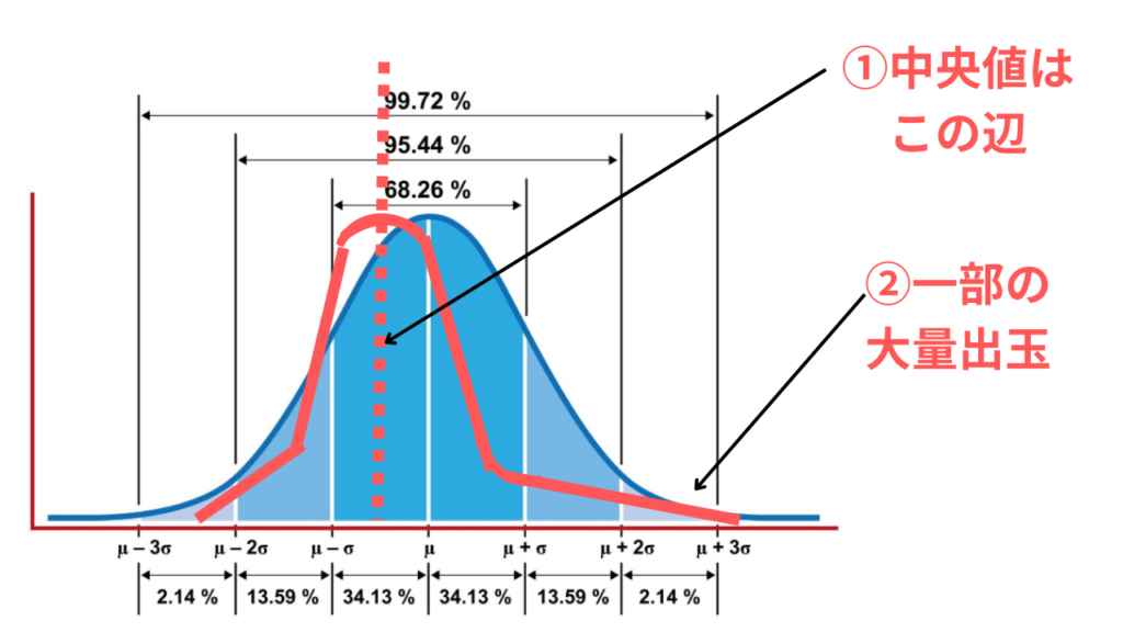 ②長期的に見ればたまに一部の大量出玉が基準を押し上げている