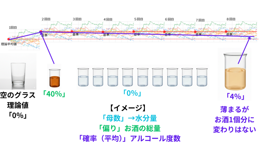 - 確率の収束とは「理論値」に「実績値」が近づくこと