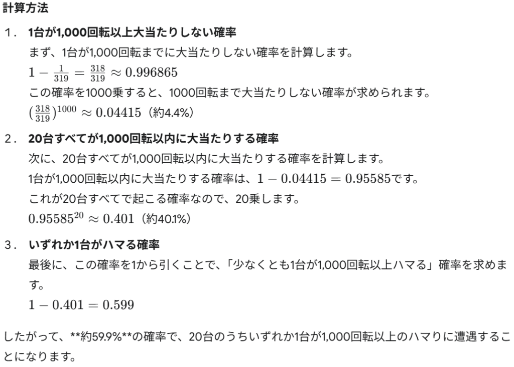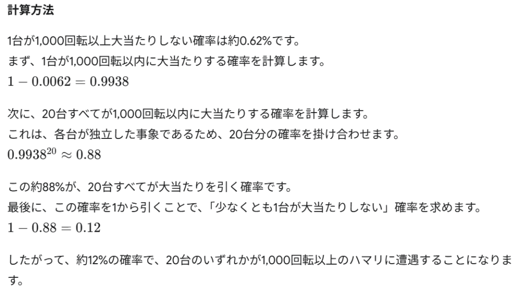 計算結果は次になり、20台のうちいずれか1台が1,000回転以上大当たりしない確率は約11.75%になります。
