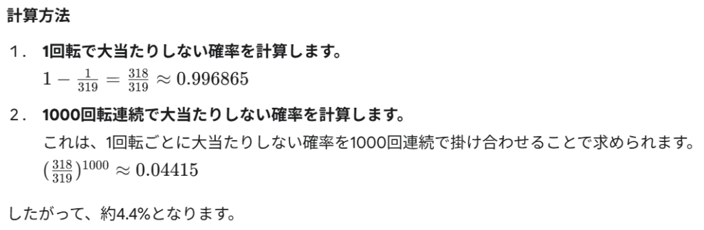 計算結果は次になり、1000回転まで当たらない確率は約4.4%になります。