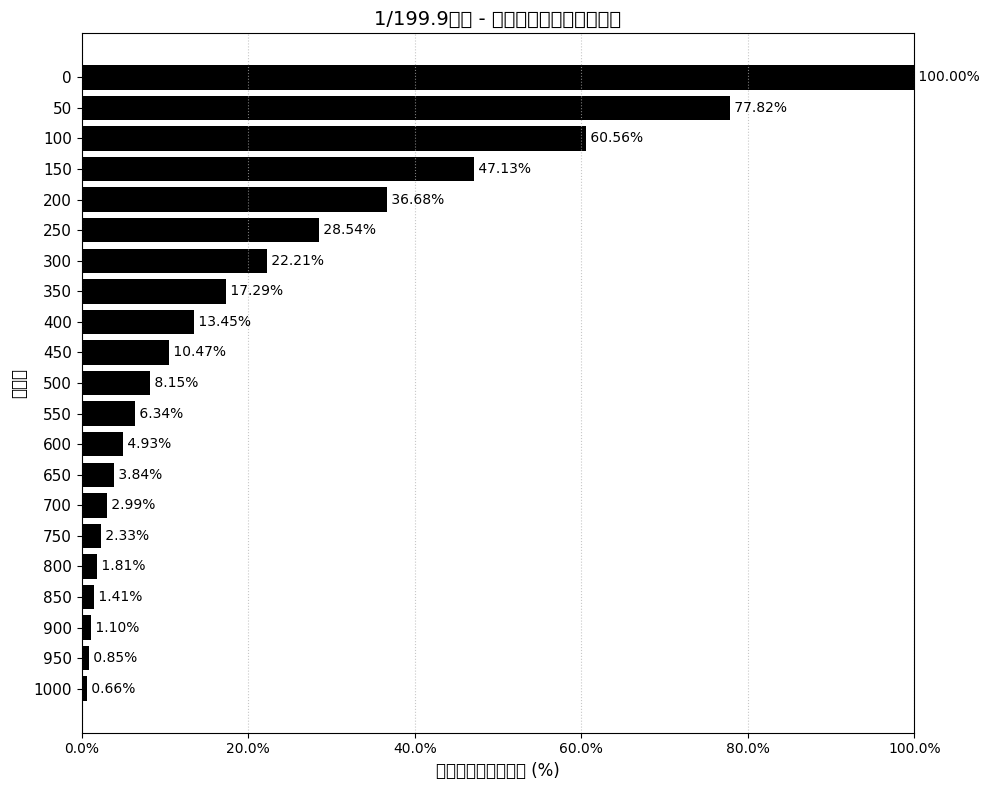 | 台数 | 1/199の場合 (1,000回転以上ハマる確率) | 1/319の場合 (1,000回転以上ハマる確率) |