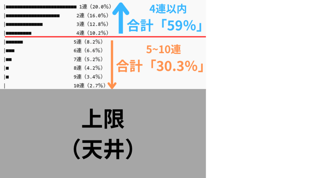 これが「無限の可能性」を秘めた「爆連」の確率ですが、逆に言えばこれが平均5連という数値の「底上げをしている」ってことです。