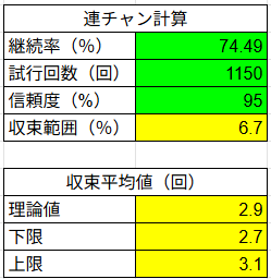 - 平均継続回数は、理論値「約2.9回」、発生率「高」「約2.1回」
