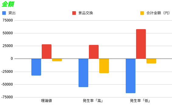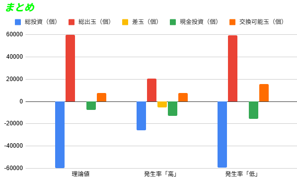 私の気になるポイントとしては、理論値通りの場合と発生率「低」の時で、合計金額に差があまりないこと。これはそれだけ波が穏やかということになります。